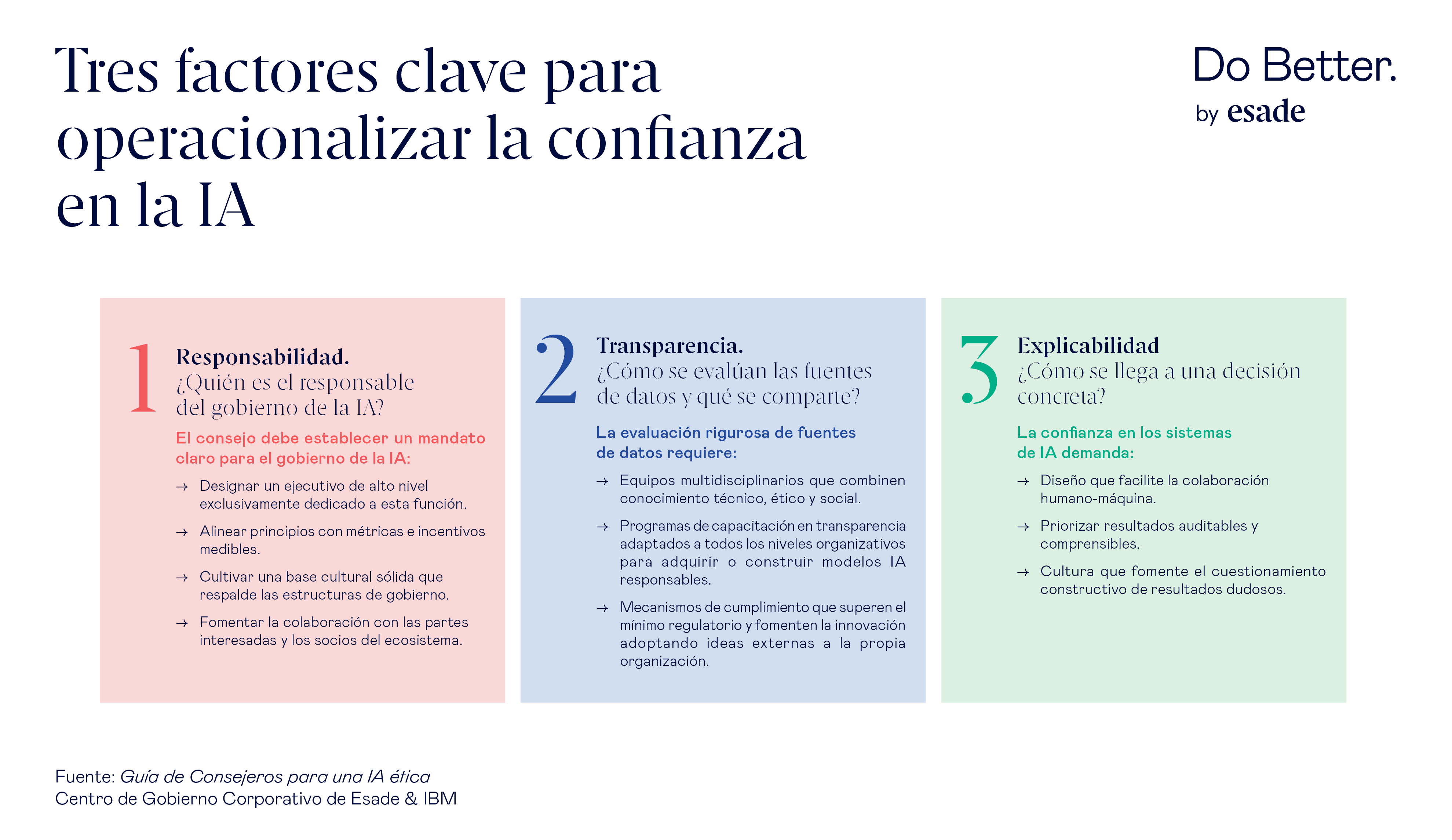 En este contexto, la Guía de Consejeros para una IA ética del Centro de Gobierno Corporativo de Esade junto con IBM realiza un diagnóstico claro de la situación y plantea recomendaciones concretas para abordar su impacto en este territorio inexplorado del gobierno de las empresas.